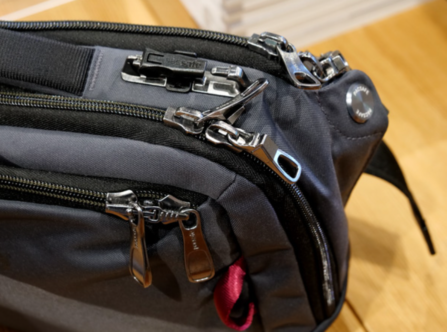 パックセーフには、ジッパー同士を複雑に連結させ、さらに一箇所でロックできる「Roobar(ルーバー)ロッキングシステム」が搭載されています。これにより、歩行中にこっそりジッパーを開けられる心配がありません。さらに、ストラップの片側が外れる「ポッピンロック」機能を使えば、レストランの椅子や柱にバッグを固定でき、置き引きの物理的なリスクを排除できます。泥棒は「時間がかかるターゲット」を嫌うため、この複雑なロックがあるだけで犯罪の対象から外れる効果も期待できます。